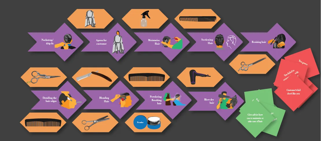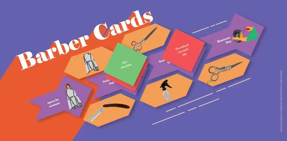 For this project, in-depth research has been done on barber shops. As India is a diverse country, there are different status of barber shops are available. From a small one-person business to a branded multi-room business, these cards are specifically made for the upper-tear businesses considering they will be more likely to spend on these cards. Processes and tools used in the projects are identified through interviews and observations. Though different approaches might be used by individual barbers based on personal choice, these cards give a fair idea of every step that should be involved in cutting of hair.