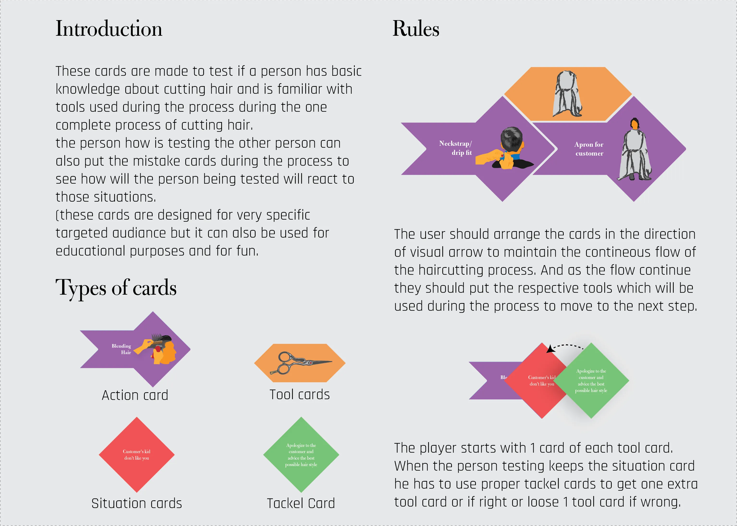 As a part of the semiotics module of one week, I created a deck of cards where one can test another person’s basic knowledge about the process involved in a cycle of cutting hair. The cards are gamified to make them exciting and challenging. In the game, one person tests another person’s knowledge by using scenario red cards to side-track the person by distracting them from arranging them in the correct order. The green tackle cards are provided to the user in the beginning, to get over the created scenarios.